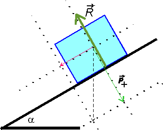 Dlatego, żeby dobrze narysować tę siłę, najpierw pomocniczo musimy wykreślić wektor składowej siły ciężkości dociskającej klocek do równi. Siłę reakcji rysujemy od punktu styczności klocka z równią, aby podkreślić, że źródłem tej siły jest równia (gdyby nie było równi, nie byłoby tej siły i klocek by spadał)