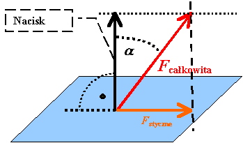 Całkowita siła oprócz nacisku może zawierać także składową styczną do powierzchni. Często jest to siła tarcia. Jeżeli odchylenie działającej siły od pionu oznaczymy przez α , to wartość siły nacisku można obliczyć ze wzoru: N = Fcałkowita · cos α